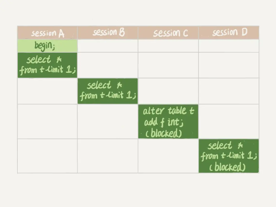 我们可以看到 session A 先启动,这时候会对表 t 加一个 MDL 读锁。由于 session B 需要的也是 MDL 读锁,因此可以正常执行。