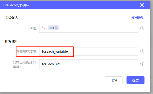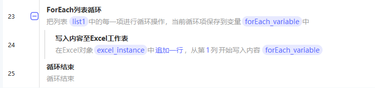 这里需要把list变量中的数据写入excel,我使用了”ForEach“指令,该指令依次循环列表中的每一项的操作,每项内容就是list类型的数据
