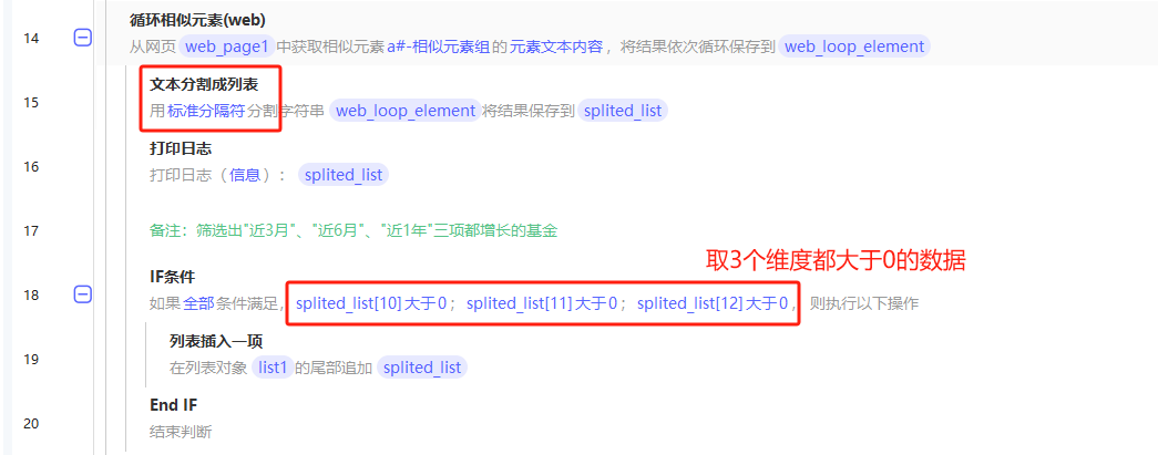 我使用的是“文本分割成列表指令”, 各个单独的字段是通过制表符分隔的,分割后,取得第11,12,13个字段,分别为“近3月"、"近6月"、"近1年",注意这里有个坑,列表是从第0个开始的