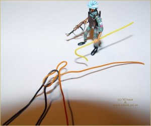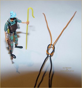 Основа солдата - простой морской узел из двух проволочек. Размер заготовок - см. линейку. Одна - это будущие руки и голова, вторая - ноги (обувь).