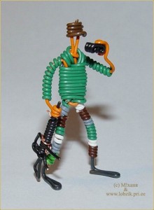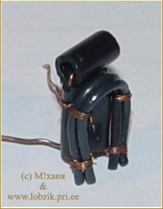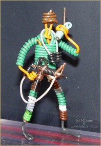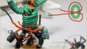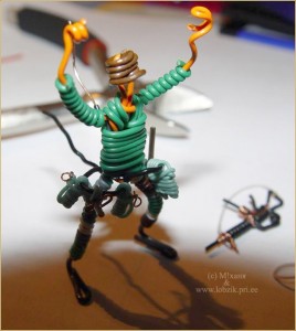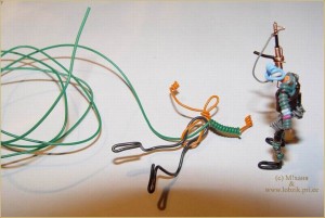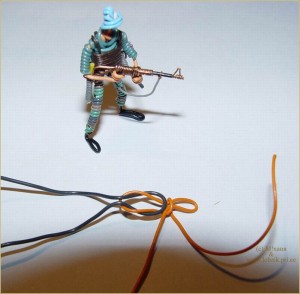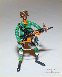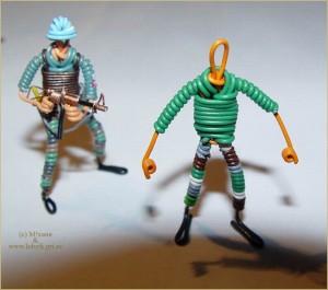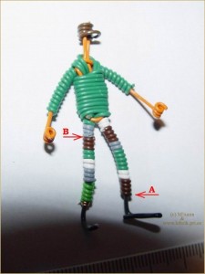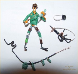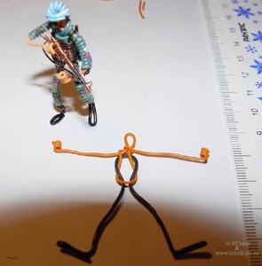 Теперь откусываем лишнее на нижних конечностях и навиваем солдату "кулачки" на обеих руках. Навивать надо вокруг проволоки, из которой в дальнейшем будем делать вооружение. И обратите внимание на направление витков. На разных руках они разные. Остатки проволоки с рук удаляем.