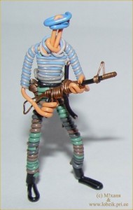 На макушке- берет. В одном месте в разрыв синей изоляции вставлен красный кусочек в пару миллиметров. Получился типа красный флажок. В руках АК из арсенала (см.выше).