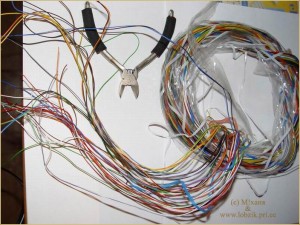 Вот, что нам потребуется для работы. Чем цветов больше, чем, разумеется, лучше. Замечательно подходят телефонные кабели номеров этак на 100, но и выкушенные из старого телевизора разноцветные проводки сгодятся не меньше. Главное, чтоб внутри была медная неплетёная жила. Проверить легко - проволока должна держать изгиб.