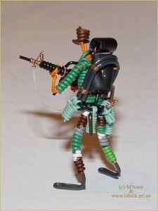 Можно без особого выпендрёжа быстро обмотать ноги солдата проволокой соответствующего цвета. Это если модель позволяет. Например армии 18-ого века отличаются своей красочностью. Благодатная эпоха. Мдаа...