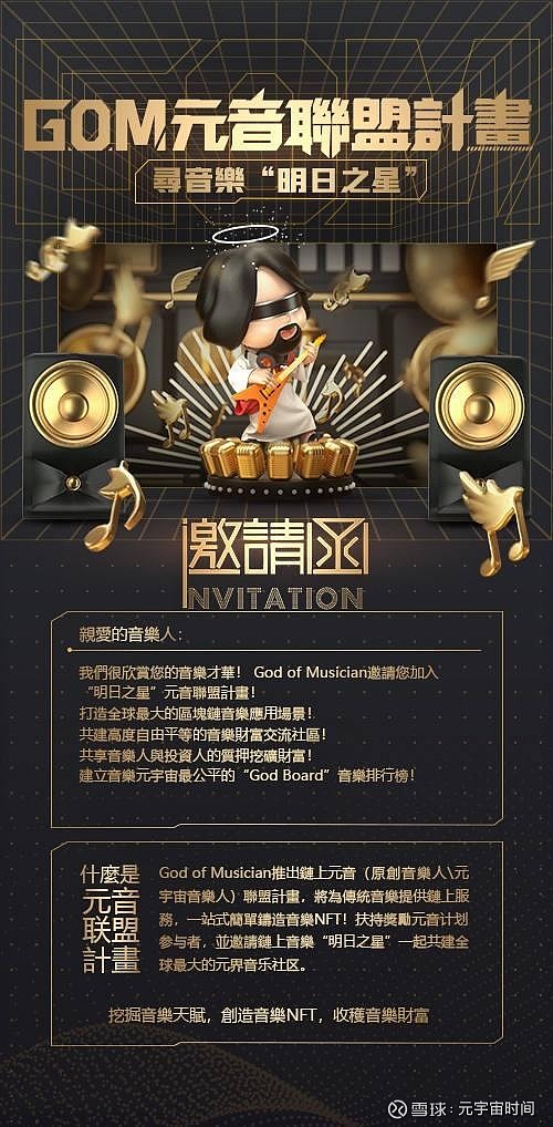 我們正在啟動元界音樂的聯盟計畫(原創音樂人\元宇宙音樂人)聯盟計畫,,將聯盟更多優秀的音樂創作者、獨立音樂人、音樂機构。聯合打造元界音樂的“Godboard榜單”。將為傳統音樂提供鏈上服務,一站式簡單鑄造音樂NFT! 扶持獎元音計畫參與者,並邀請鏈上音樂“明日之星”一起共建全球最大的元界音樂社區,G.O.M投入廣告費用于宣传全球優秀音樂人,幫其擴大影響力,打造元界音樂多維度商業價值!