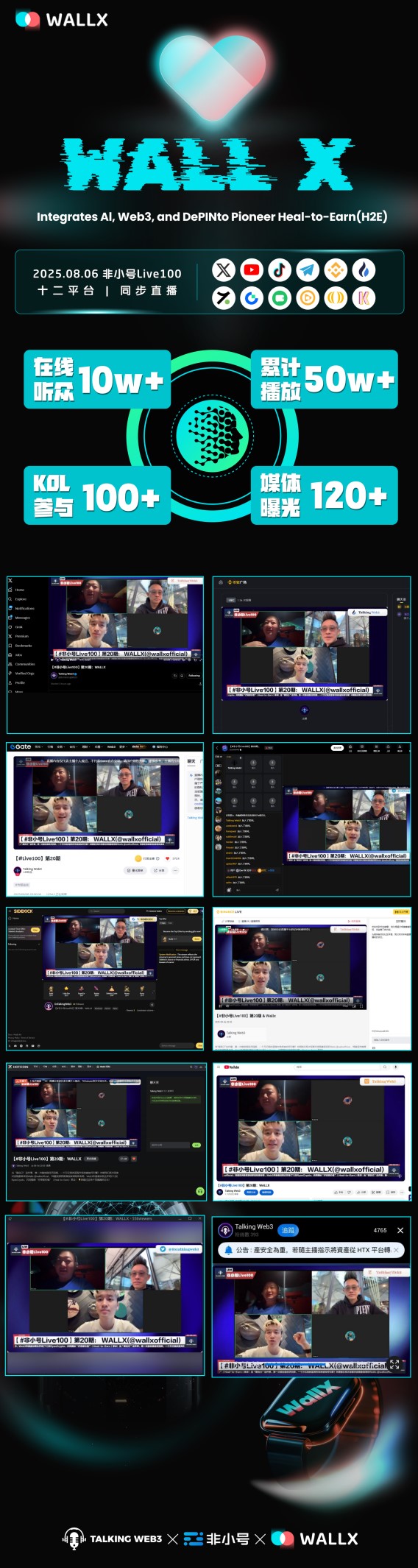 2025年8月7日 – 全球首个Web3疗愈生态项目WALLX (@wallxofficial) 于昨日(8月6日)晚间,联合行业领先的数据与媒体平台非小号 (Feixiaohao) 成功举办的第20期“#非小号Live100”线上直播峰会,取得了现象级的成功。数据显示,本次直播在12个主流平台同步进行,在线听众峰值突破10万,累计播放量超过50万,吸引了逾100位行业KOL参与,并获得了超过120家媒体的曝光,引爆了整个亚太Web3社区。