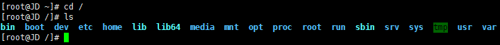 输入命令 cd / ,进入根目录,再输出命令 ls ,查看根目录下都有什么目录: