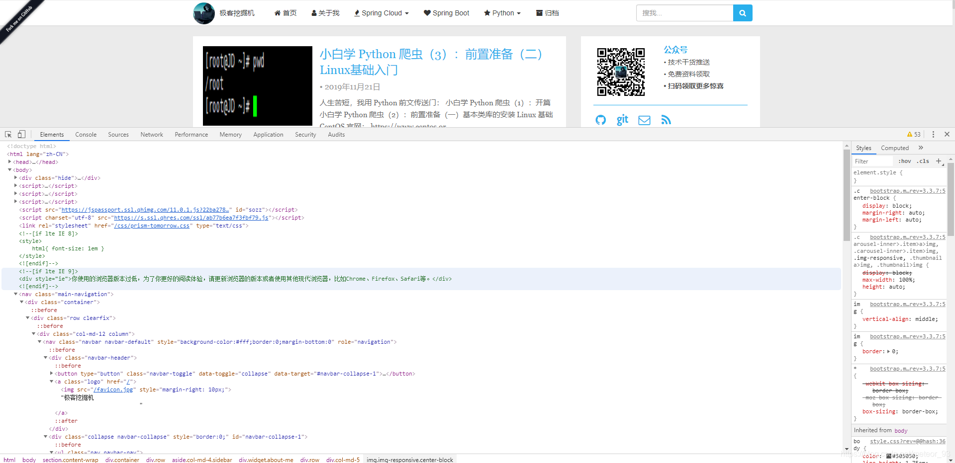 我们来看一下一个真实的网站的源代码是怎么样的,在 Chrome 浏览器中,使用 F12 打开开发者工具。