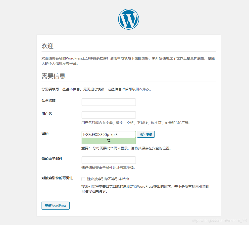 然后访问 http://ip:port/wordpress ,可以看到连接自动跳转到了 http://ip:port/wordpress/wp-admin/install.php ,然后顺着 WordPress 的指引,一步一步的填写站点相关信息和数据库的相关信息即可。