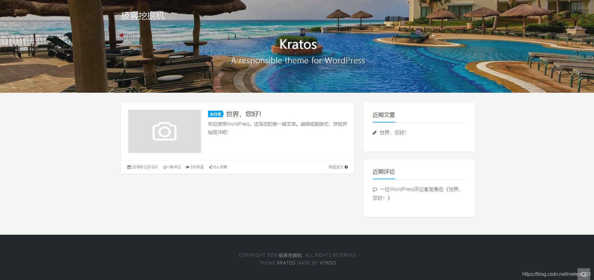 小编在百度上找到了一个国人开发的主题:Vtrois-Kratos 。将这款主题的压缩包解压后,上传至 WordPress 的 theme 目录下,小编这里的目录为: /var/www/html/wordpress/wp-content/themes 。