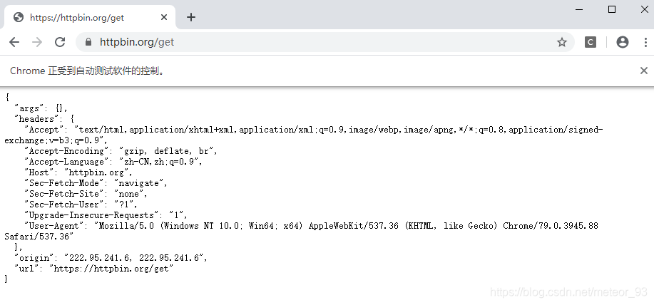 我们先使用 urllib 来做测试,测试的链接就选择:https://httpbin.org/get 这个我们之前用过的测试链接,访问该站点可以得到请求的一些相关信息,其中 origin 字段就是请求来源的 IP,我们可以根据它来判断代理是否设置成功,也就是是否成功伪装了 IP ,代理嘛小编就在网上随便找了个免费的高匿代理,示例如下: