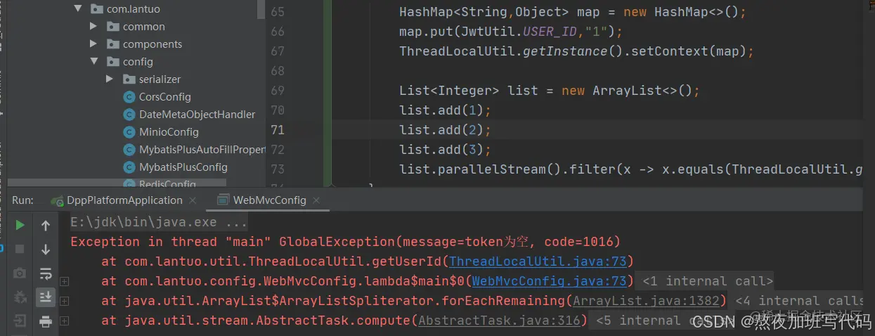 这是为什么呢?因为Jdk8的Stream底层使用了ForkJoinPool线程池,这就导致当我们调用 ThreadLocalUtil.getUserId()的时候,是直接提交到了ForkJoinPool线程池中去了,这时候就会有其它线程去调用这个方法,所以就拿不到值了