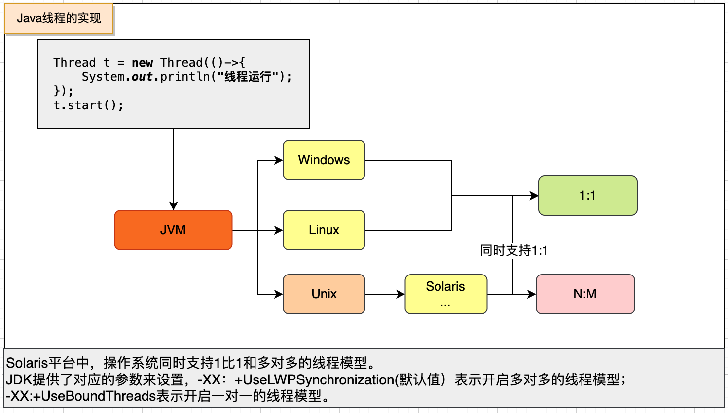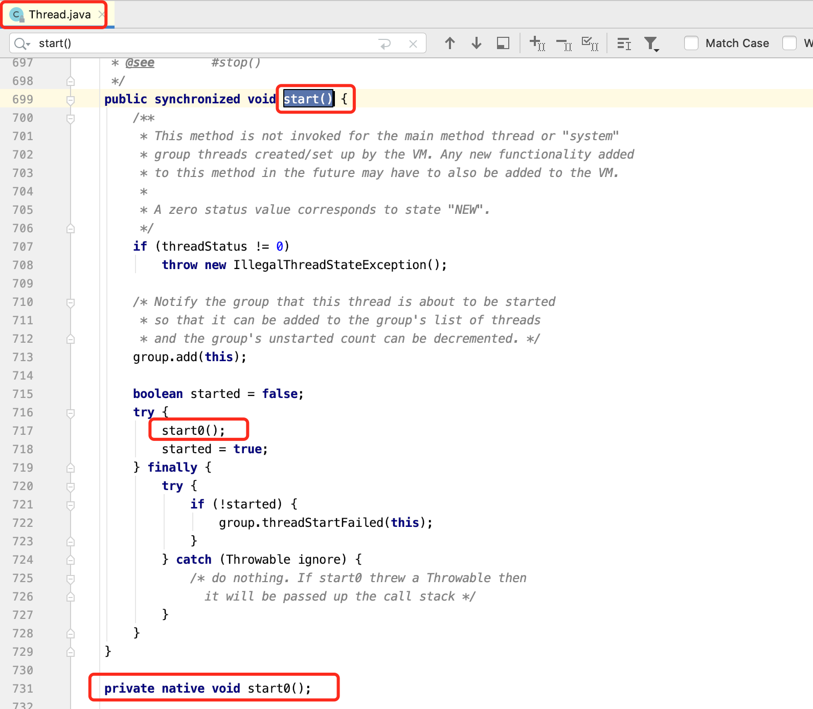 当我们追踪Java线程的实现时,可以发现Thread类的start方法最后会运行一个start0方法,而这个方法是native的,也就是交由JDK来实现的(JDK会屏蔽调底层操作系统的差异,提供给Java开发者一套通用的线程接口)