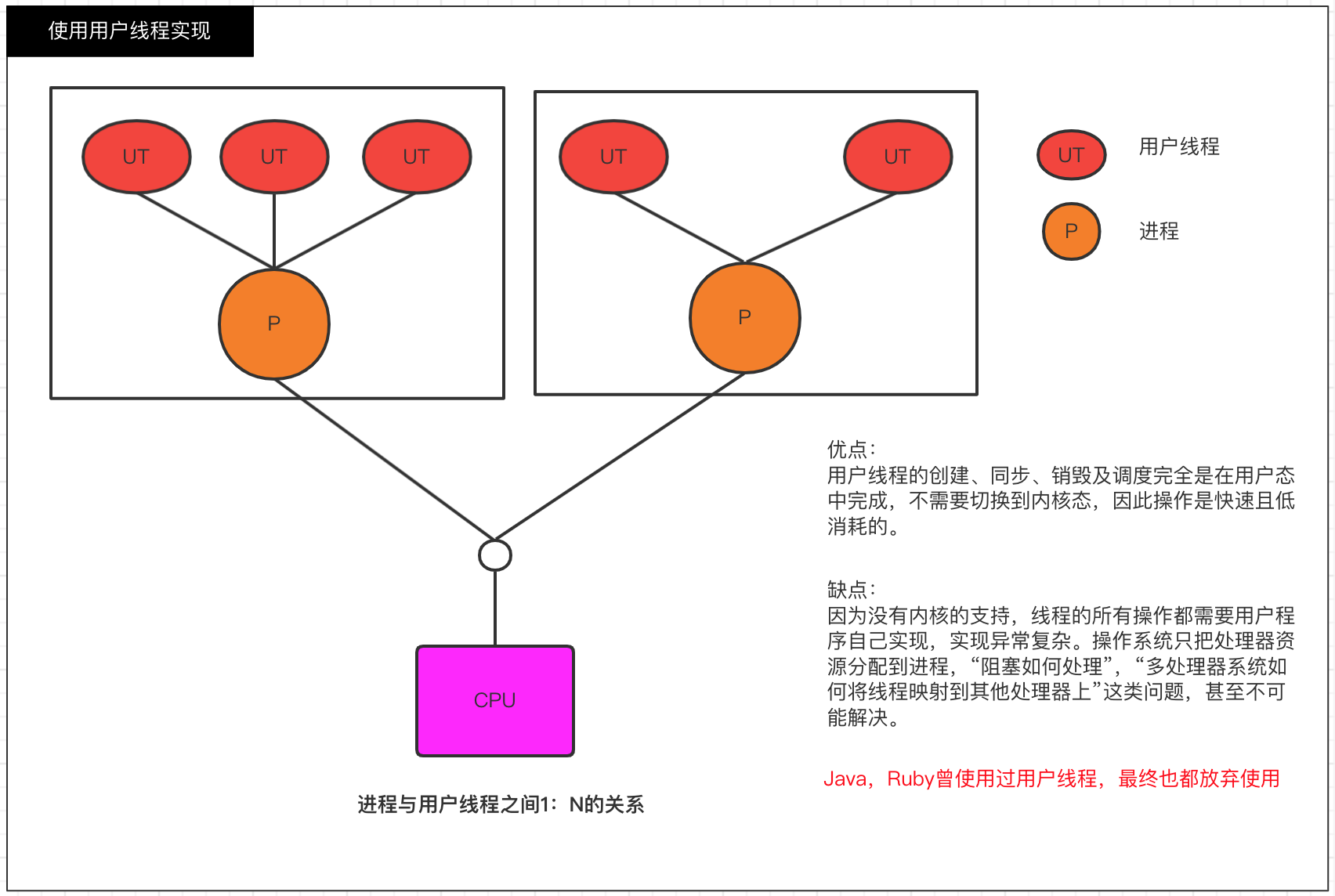 用户线程的创建、同步、销毁及调度完全是在用户态中完成,不需要切换到内核态,因此操作是快速且低消耗的。 -