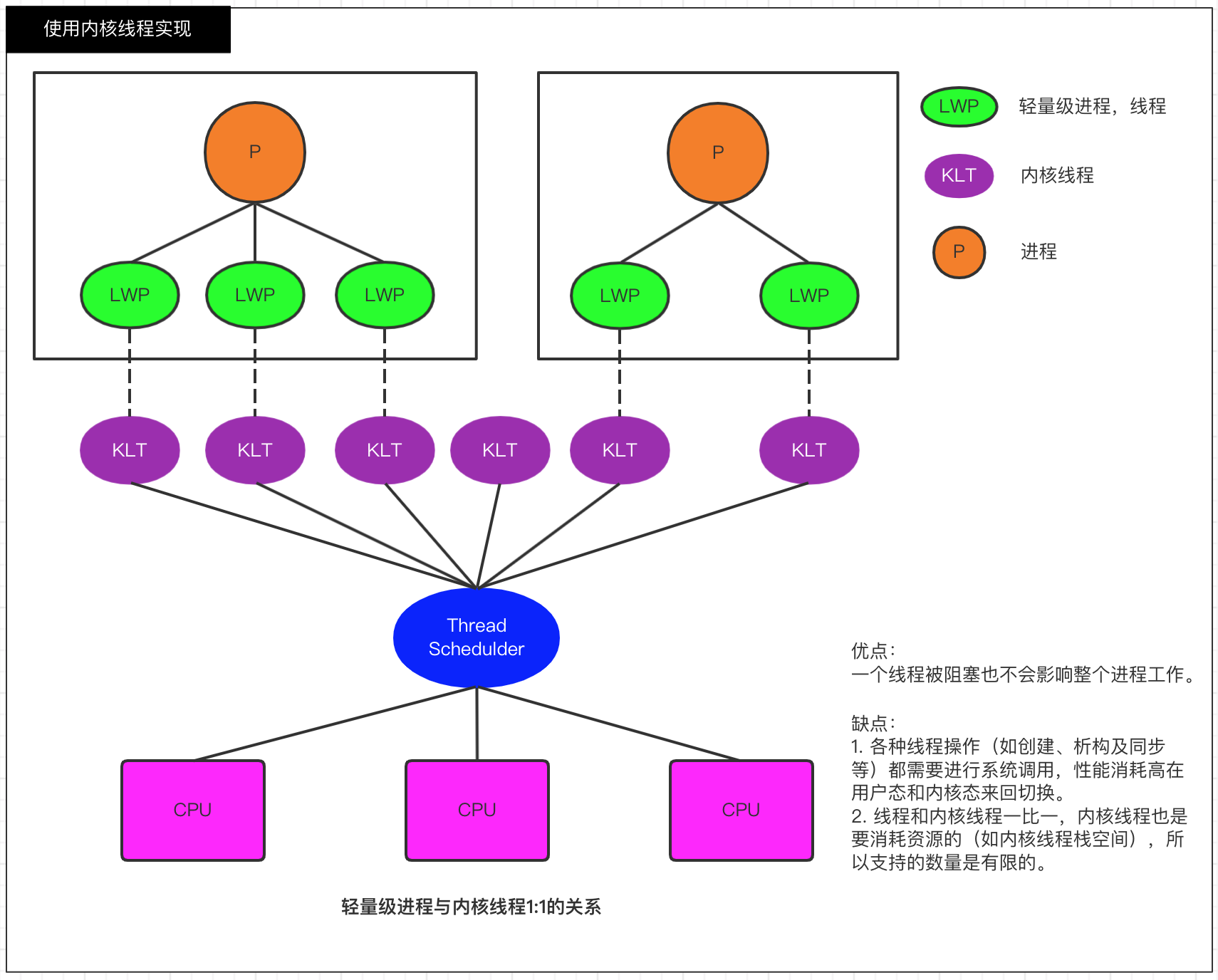 - 线程和内核线程一比一,内核线程也是要消耗资源的(如内核线程栈空间),所以支持的数量是有限的。