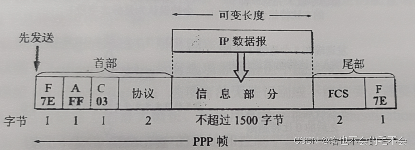 首部的第一个字段和尾部的第二个字段都是标志字段 ,格式是0X7E,表示后面的字符是用十六进制表示的。A是地址字段,规定为0xFF。C是控制字段,规定为0x03。这两个字段相当于js中的保留字,至今仍为对其赋予含义。
