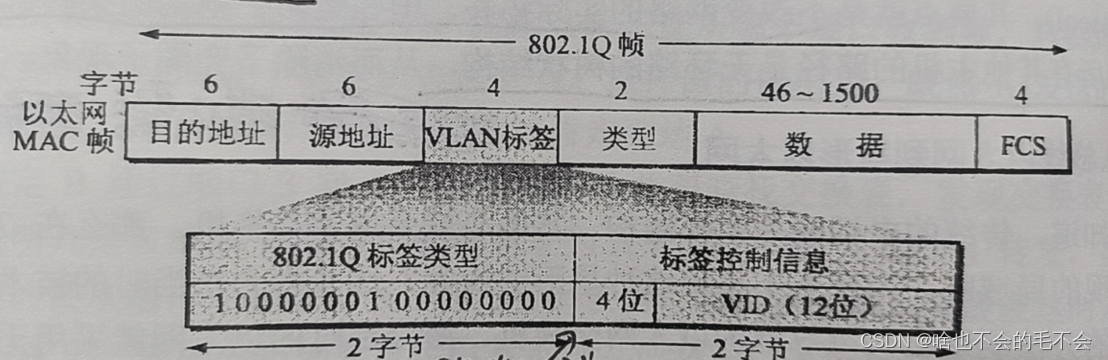 VLAN标签中前两个字节是802.1Q标签类型,后两位字节是标签控制信息,标签控制信息中前四位里,前三位是用户优先级,第四位是规格指示符,剩下的十二位是VID(即VLAN ID),他标志着这个帧属于哪一个VLAN。