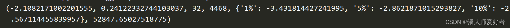 第一个值为t统计值,第四个值为字典,分别是出错率为1%,5%,10%所对应的统计临界值。若t值小于对应临界值值,表示在该出错率下序列本身平稳,反之则不平稳。第二个值表示的是整体检验的显著性,其值越接近于0,说明序列本身越平稳。一般地,以0.05作为标准。为