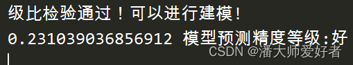 可以看出,检测通过可以进行后续预测。需要注意的是,如果级比检验未通过,则需要对数据进行转换,笔者尝试过一些转换方法,但是最终效果的都不太理想。因此,当遇到级比检验不通过时,更建议更换模型,因为转换数据通过级别检验的概率比较低,有兴趣者可以对数据的转换做进一步深入,此处选择忽略。