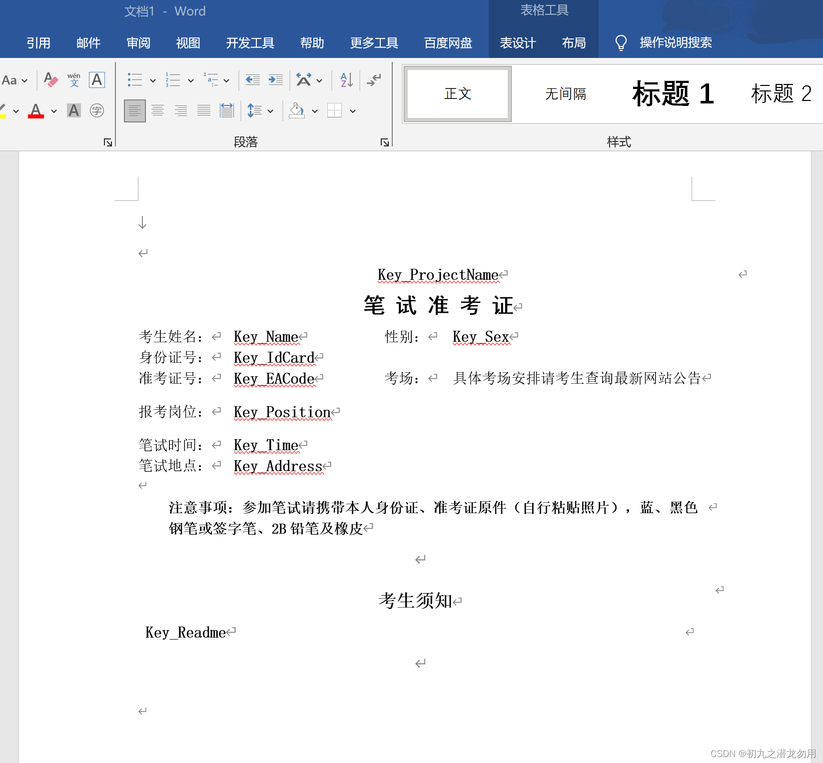 1、设计WORD模板,在需要输出值的地方设置 自定义关键字+字段名(如%%_name),其中%%_为自定义关键字,name为输出字段名。
