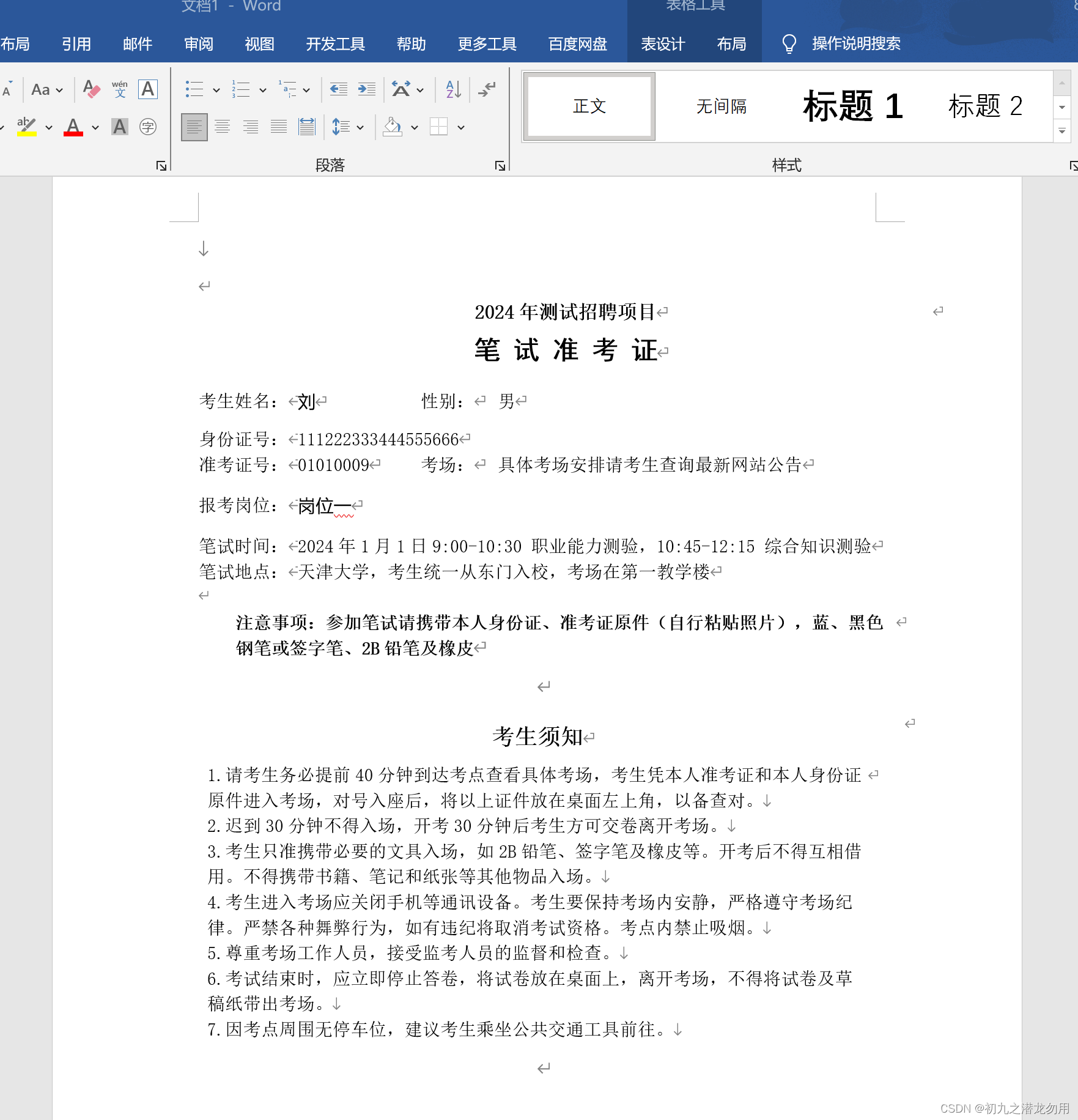 举例我们需要提取人员的基本信息生成准考证并打印如下图: