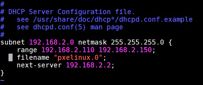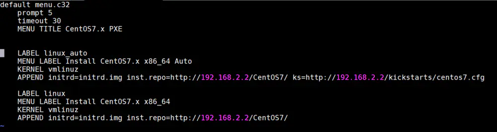 APPEND initrd=initrd.img inst.repo=http://192.168.2.2/CentOS7/ ks=http://192.168.2.2/kickstarts/centos7.cfg