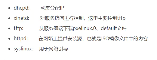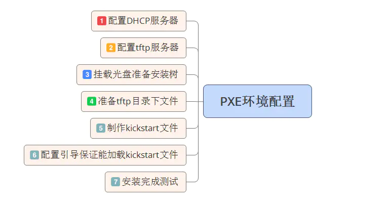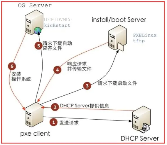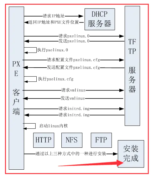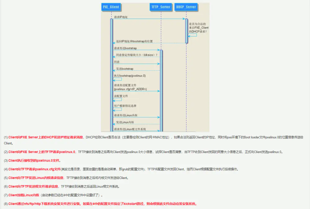 运行 PXE 协议需要设置 DHCP 服务器和 TFTP 服务器,DHCP 服务器会给 PXE Client(将要安装系统的主机)分配一个 IP 地址,由于是给 PXE Client 分配 IP 地址,所以在配置 DHCP 服务器时需要增加相应的 PXE 设置。此外,在 PXE Client 的 ROM 中,已经存在了 TFTP Client,那么它就可以通过 TFTP 协议到 TFTP Server 上下载所需的文件了。