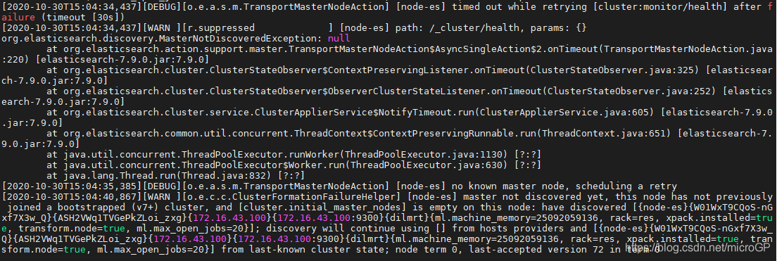 先是:org.elasticsearch.discovery.MasterNotDiscoveredException: null