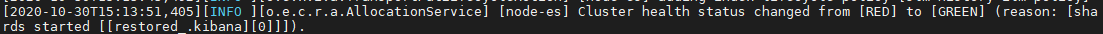 接下来elasticsearch内部的数据会进行数据格式的转换,由于笔者的环境是测试环境,数据量有限,所以转换速度很快,如果数据量很大,此处的时间可能会长些,在此过程中,server的日志会频繁的报cluster的healthy状态从RED到GREEN或者从YELLOW到GREEN,等此过程完毕后,则该阶段的升级完成