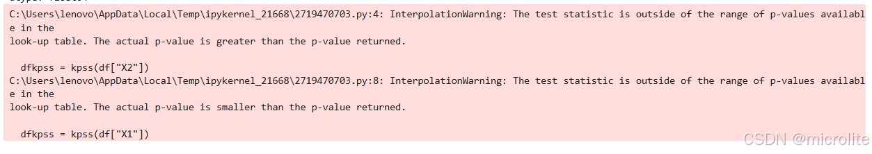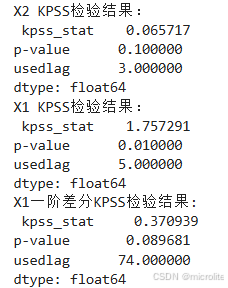 报错解释:因为KPSS检验计算得到的P值范围是0.1~0.01,所以X1的实际P值小于0.01,X2的实际P值大于0.1,只是无法显示。