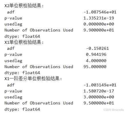 X2的P值大于0.05,认为其是平稳的;X1的P值小于0.05,认为其是不平稳的;一阶差分X1的P值大于0.05,认为其实平稳的