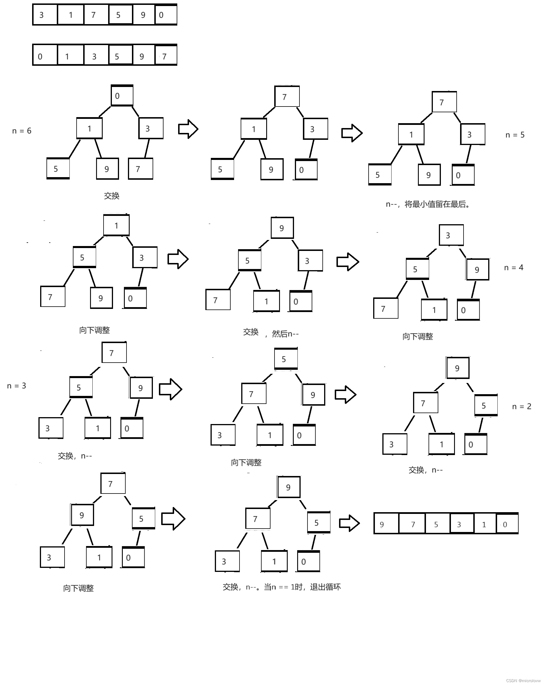 当我们创建小堆的时候我们会得到最小值,然后我们将最小值与最后一个数据交换,并将传入向下调整的堆元素个数-1,这样我们就可以保存好最大值;然后将交换的值向下调整,这样我们就可以找到次大值,并再次放到最后。然后n--,以此类推。
