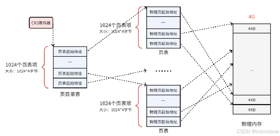 - ⻚⽬录的物理地址被 CR3 寄存器 指向,这个寄存器中,保存了当前正在执⾏任务的⻚⽬录地址。