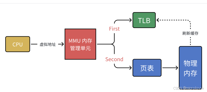 当 CPU 给 MMU 传新虚拟地址之后, MMU 先去问 TLB 那边有没有,如果有就直接拿到物理地址发到总线给内存,⻬活。但 TLB 容量⽐较⼩,难免发⽣ Cache Miss ,这时候 MMU 还有保底的⽼武器⻚表,在⻚表中找到之后 MMU 除了把地址发到总线传给内存,还把这条映射关系给到TLB,让它记录⼀下刷新缓存。