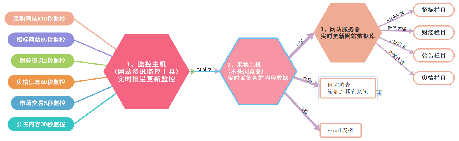 1、实时监控更新和采集内容原理:首先在一台监控主机上运行网站资讯监控软件,添加需要监控的网址,以监控网站首页或栏目列表页为主。当发现更新后,立即将更新的新闻标题和链接发送到采集主机。当采集主机收到新闻链接后,自动使用木头浏览器打开网页,采集新闻标题和正文内容,然后保存到数据库或导出Excel表格文件,也可以再填表提交到其它系统。其中监控主机和采集主机可以分别部署在不同电脑上,也可以部署在同一台电脑上,它们通过网络接口实现数据传递。