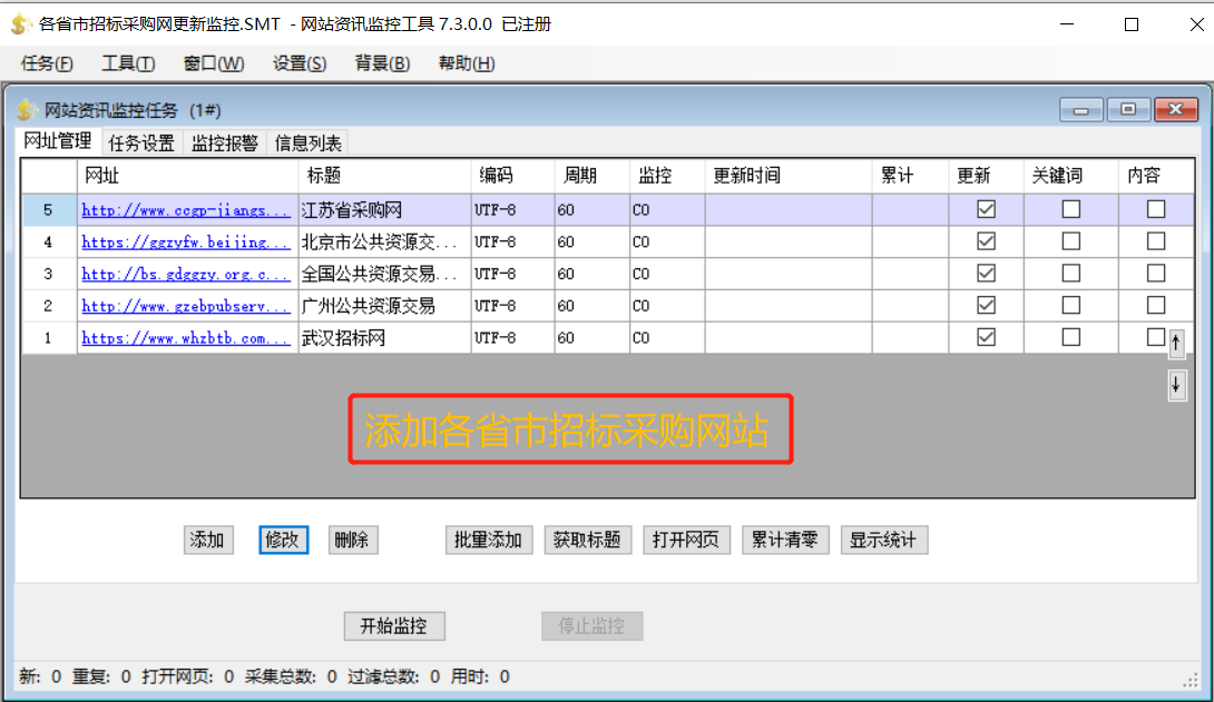 2、首先部署在监控主机的网站资讯监控软件,添加需要监控的网址,可以选择监控网站首页或栏目页面。只要是超链接列表格式的网页都可以直接监控,其它特殊格式页面则需增加对应的监控方案。每个监控网站可以设置不同的监控频率,对于实时性要求高的网站设置高频率监控。多个网址独立线程按自有频率同时监控。还可以按关键词过滤无效内容,具体参数设置请参见软件说明书及案例教程。