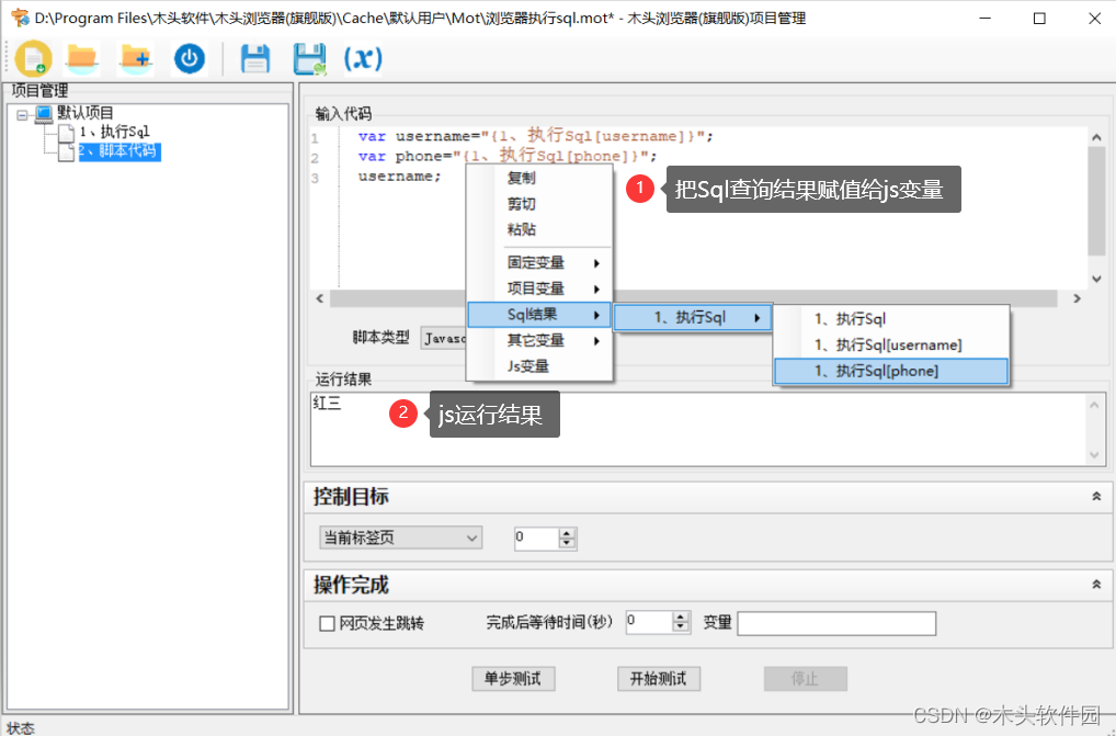 在JS代码输入框中,点击鼠标右键选择Sql查询结果中对应的字段,这样就把Sql查询结果赋值给JS变量了。