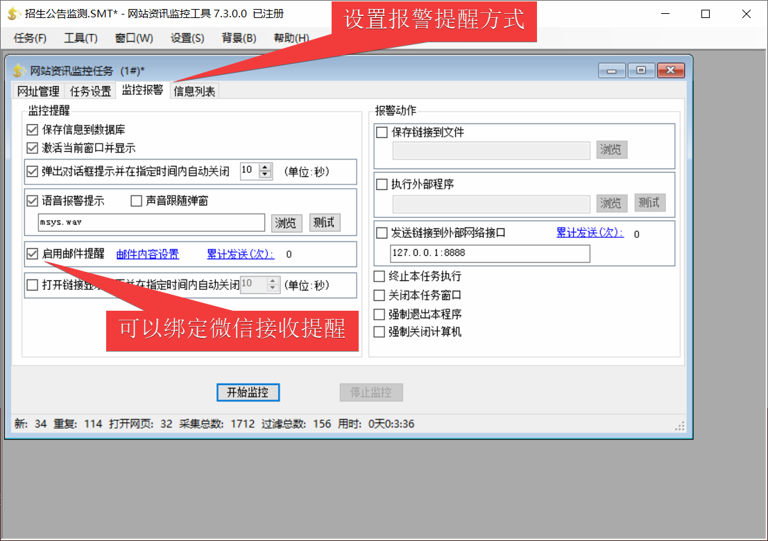 如果不常在电脑前,也可以把最新公告推送到邮箱,再用微信绑定邮箱,最终实现手机微信及时提醒招生公告。在“监控报警”选项卡,勾选启用邮件提醒 ,设定邮件收发参数就可以了。