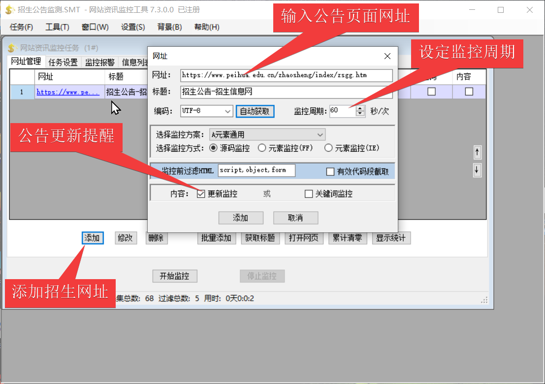 运行网站资讯监控工具,在网址管理中,点击“添加”按钮,输入招生公告栏目的网址,可以点击“自动获取”按钮,获得网站的标题和编码信息,再设定一个合理的监测周期(不建议设置太小,一般60秒以上);选择“a元素监控方案”,即监测这个页面的所有超链接;选择“更新监控”,即当页面出现新的公告链接时,就发出通知警报。