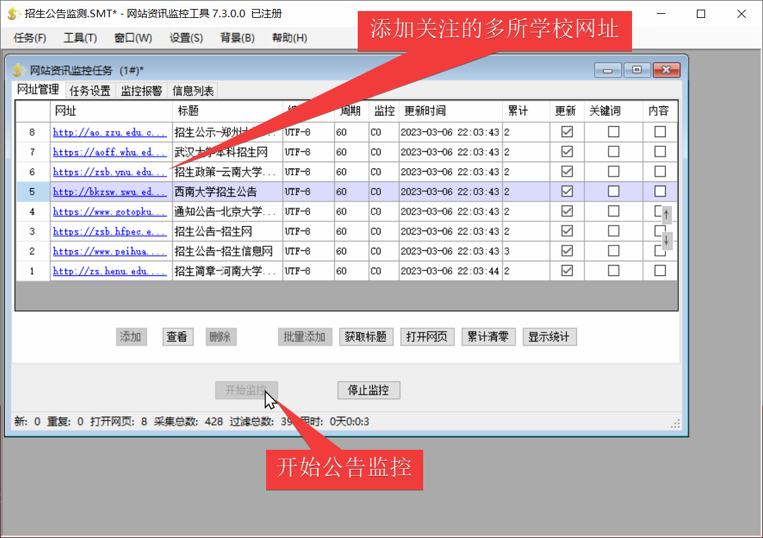 按照上面的方式,可以同时添加多个学校招生公告页网址,每个公告网址可以设定不同的监控周期,点击“开始监控”按钮,软件将为每个网址创建一个独立的监控线程,同时监测全部网站。
