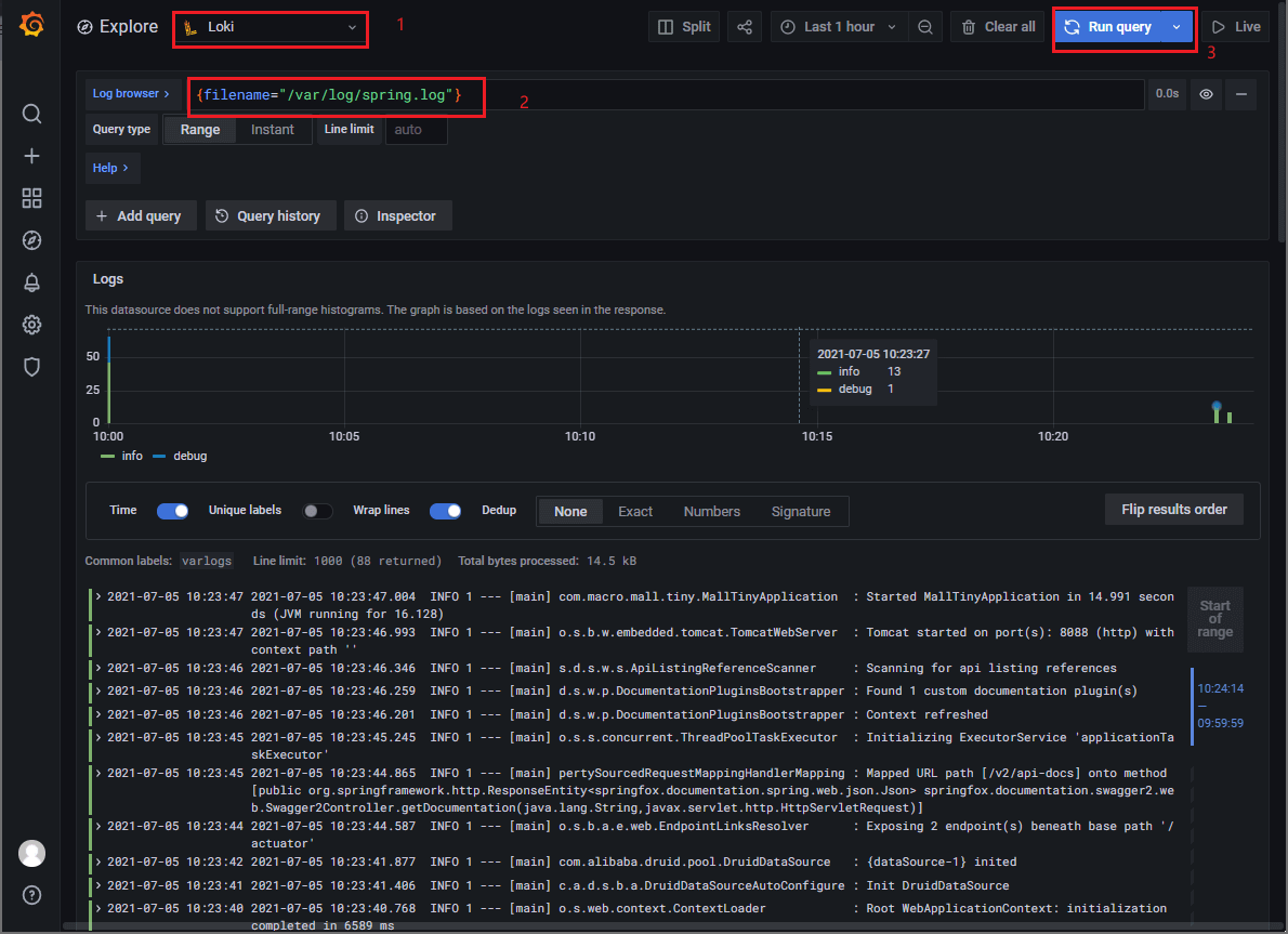 Explore选择Loki,并输入查询表达式(Loki query)为{filename="/var/log/spring.log"},就可以查看我们的SpringBoot应用输出的日志了。