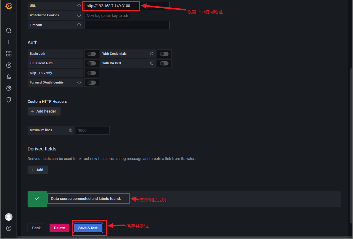 Save&test保存并测试,显示绿色提示信息表示设置成功,Loki访问地址:http://192.168.7.149:3100