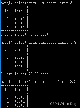 其中,中括号里面的参数是可选参数,位置偏移量是指MySQL查询分析器要从哪一行开始显示,索引值从0开始,即第一条记录位置偏移量是0,第二条记录的位置偏移量是1,依此类推...,第二个参数为“行数”即指示返回的记录条数。效果如图 自行理解