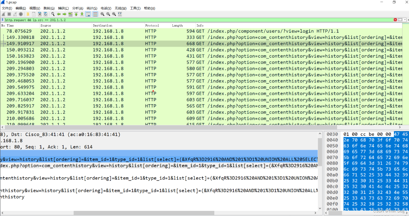 过滤后可以看到两个出现次数比较多的ip,202.1.1.2和192.168.1.8,可以看到202.1.1.2对192.168.1.8进行了攻击