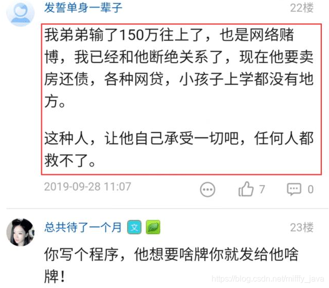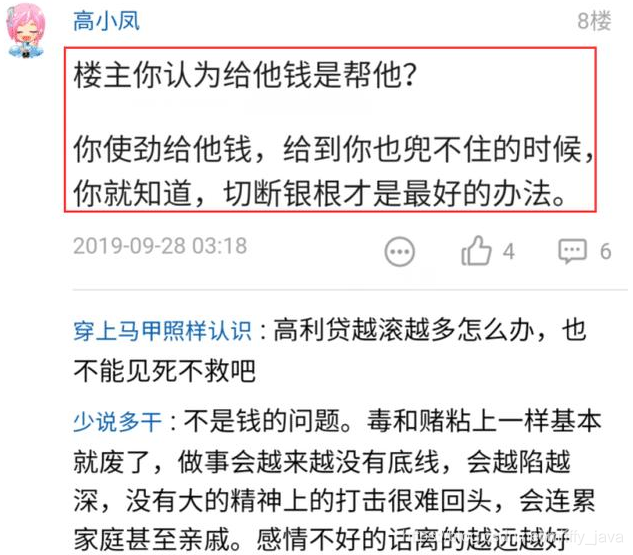 从帖子中看出来这位华为员工的担心也是有道理的,要知道这个世界最难做到的就是戒掉牌瘾。你即使借钱给他还债了,但是你能够保证他以后不这么做吗?你又不天天在他身边,怎么能够管得住他呢?借一次钱容易,要是以后输的更多,你难道 每次都帮他还债吗?再多的钱也填不满这个窟窿。那么,网友是怎么回复的呢?