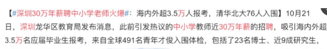 其实为什么老师说的地位和职业发展都比程序员高,要知道从长远角度看,老师可以做到退休,而且很少加班,工作有保证,而且假期又长,更不要说有30万年薪,而程序员不同,加班是家常便饭,即使工资高都是加班熬出来的,最重要一点程序员做不到退休,这二者区别很大,但是老师年薪30万还是少数,就像这次深圳老师招聘的对象基本都是名校,竞争非常大,所以凡事都有利弊,心态放平一点比较好。