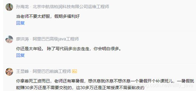 还有网友说:其实不是钱不钱的问题,最重要的是老师上班可以和同事有说有笑,还有寒暑假,生活多姿多彩。 程序员就那个吊样,生活如同死鱼。