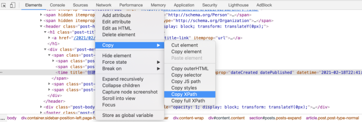 有一些同学在写爬虫的时候,喜欢在Chrome 开发者工具里面直接复制 XPath,如下图所示: