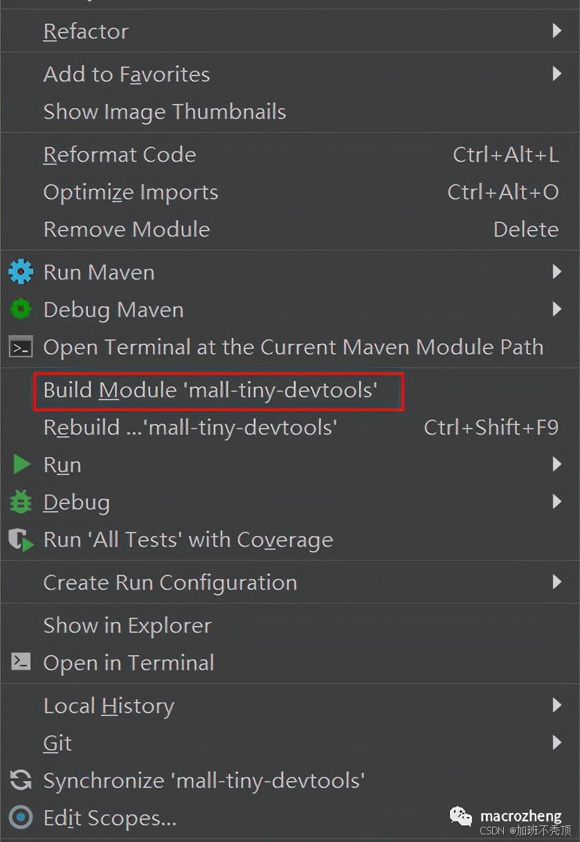 - 远程调试如果自动构建的话会导致远程服务频繁重启,此时我们可以使用IDEA手动构建,在项目的右键菜单中可以找到构建按钮;