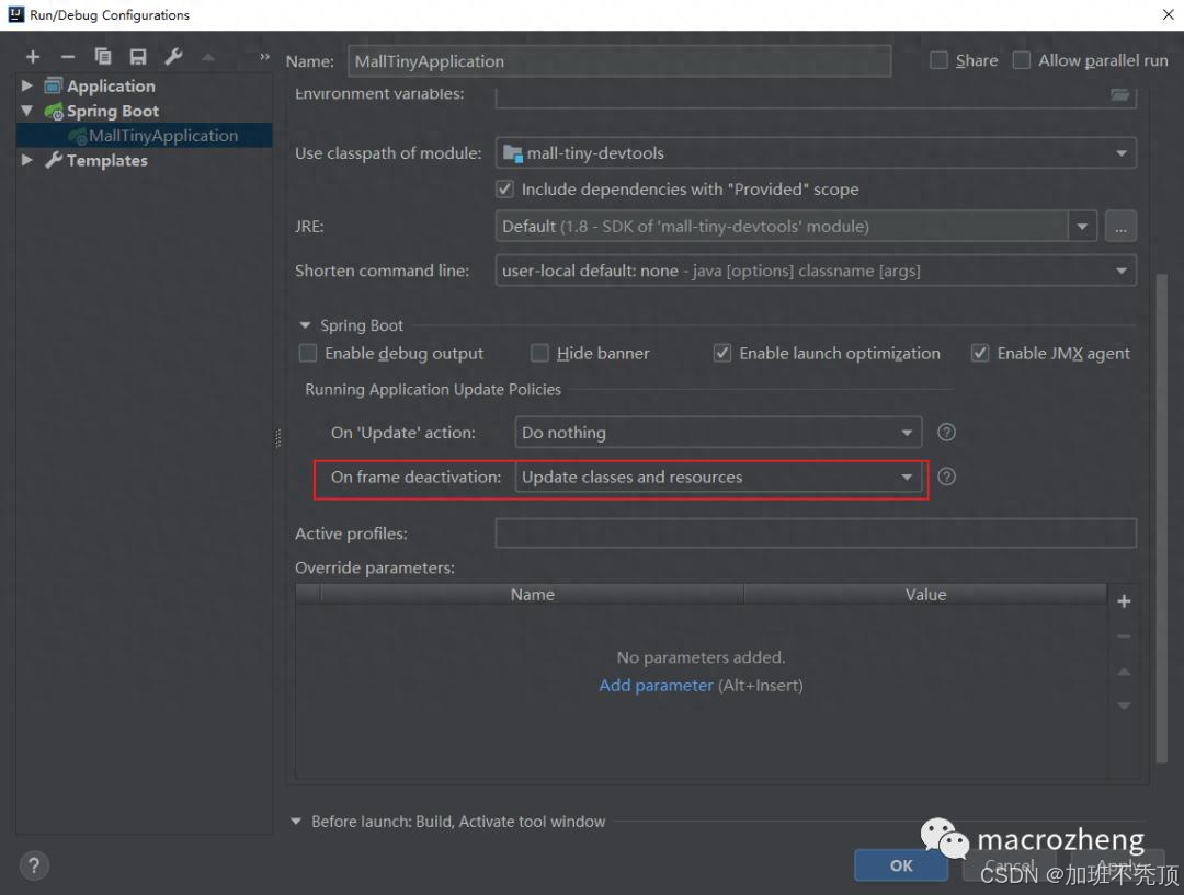 - 由于在项目构建时,devtools才会自动重启项目,而IDEA默认并没有使用自动构建,此时我们可以修改应用启动配置,设置当IDEA失去焦点时自动构建项目;